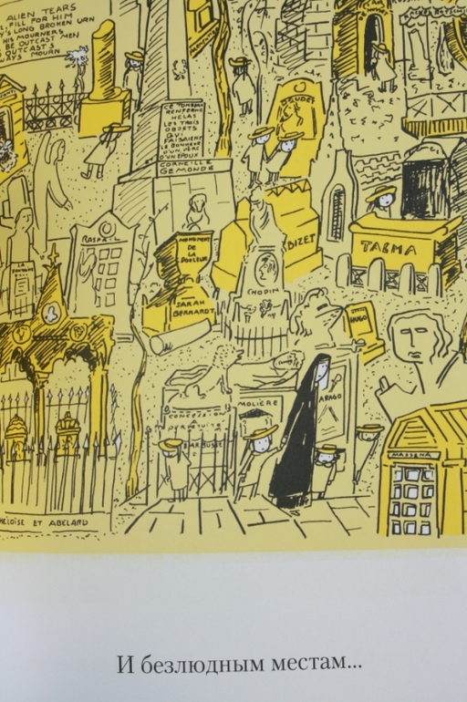 На верхней и следующей картинке дети ищут собаку. Иллюстрацию с кладбищем можно рассматривать долго, узнавая знакомые имена: