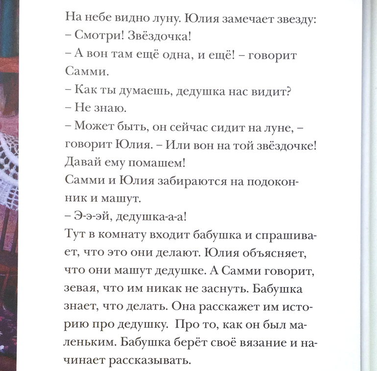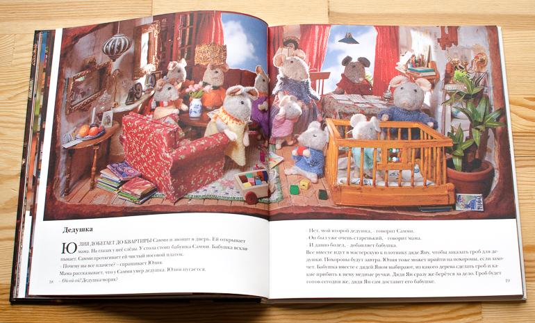 Из всех событий книги самым неожиданным для меня оказались похороны. У Самми умер дедушка, он был очень стареньким и давно болел, весь мышкин дом скорбит об утрате. Целый разворот занимает иллюстрация, на которой изображена мастерская, в которой плотник изготавливает гроб. Но прочитайте, как уместно и легко Карина Схапман рассказывает о таких непростых вещах.