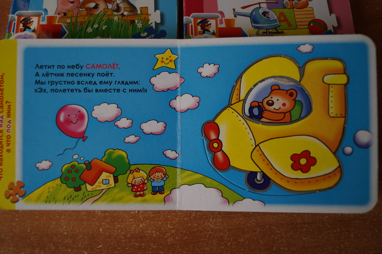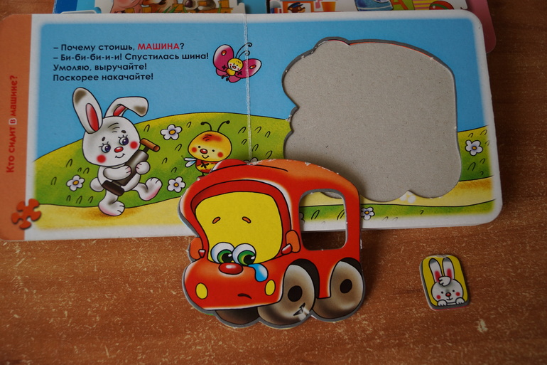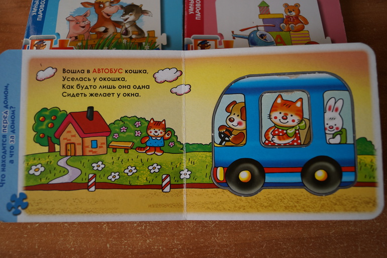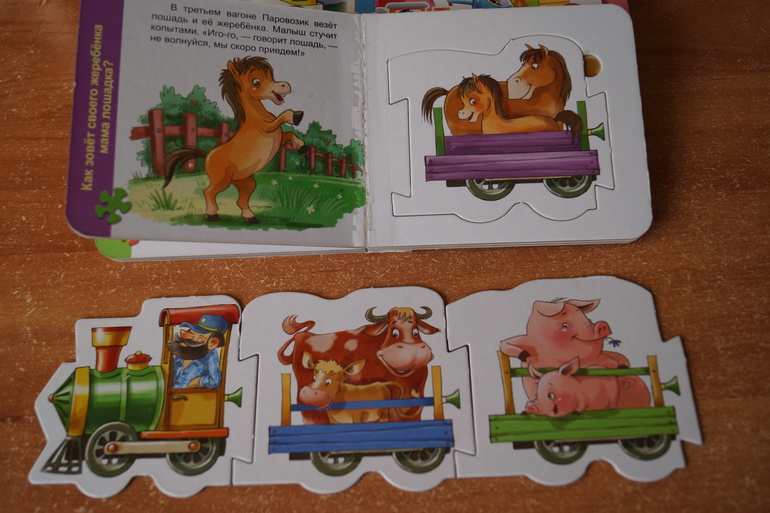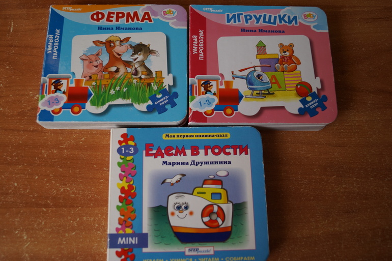 Из книг-игрушек нам полюбились нам такие с пазлами и вкладышами-вагончиками.