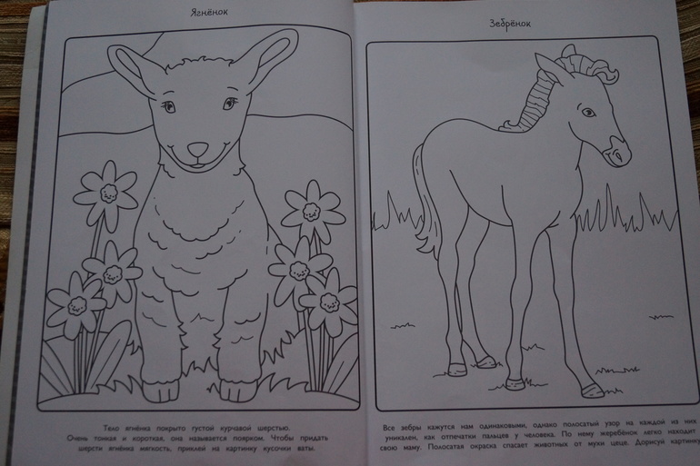 Книга очень большого формата, с одной стороны фотография животного, с другой - рисунок, который можно разукрасить и краткая информация.
