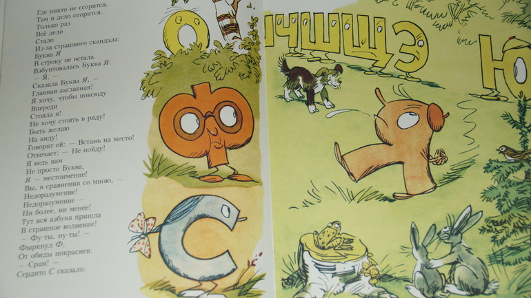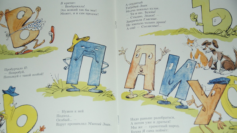 И снова уникальный и неповторимый заходеровскй язык! Каждая буква у него проделывает действие, созвучное ее внутреннему содержанию: Ф - фыркнула, П - пробурчала, Мягкий Знак - промямлил. Не стихи, а сплошное фонематическое наслаждение! Я глубоко убеждена, что подобные игры слов и звуков очень полезны для детского слуха. Они позволяют почувствовать родной язык, так сказать, распробовать его на вкус и проглотить с удовольствием: