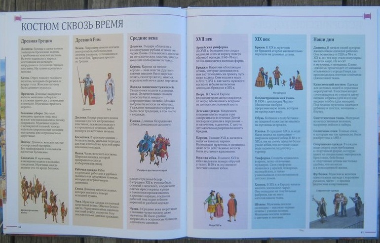 В конце книги есть несколько разворотов энциклопедического характера. Очень-очень полезная информация, я такой систематизации нигде еще не встречала. Несколько тем, несколько колонок по эпохам и информация по особенностям: архитектуры, технологии, труда и досуга, костюма. Особенно мне понравилось про костюмы и аксессуары. Взять хотя бы те же доспехи: они были в Древней Греции, и Древнем Риме, и в Средние века, но какими же они были разными! А вот в XVIIвеке уже появилась армейская униформа. Очень интересно и познавательно, а главное можно видеть развитие и сравнить: что было тогда, и что потом, а что сейчас. Кстати, это относится и ко всей книге!