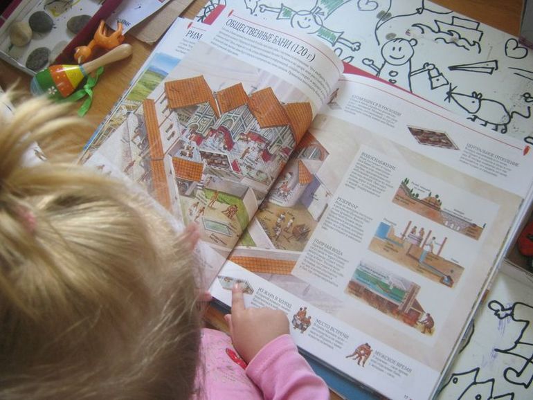 Книгу я пока рассматриваю сама, вспоминаю свое увлечение историей и те, другие энциклопедии, которые я когда-то видела. Нигде такого не встречала, что историю можно рассматривать и в разрезе зданий. Видно, я в детстве не начиталась и не насмотрелась, если могу взять с детской полки эту книгу и периодически перелистывать. Это просто находка для всех любителей истории, ведь прекрасно известно, что многие наши увлечения идут именно с детства. Мои детские часы, проведенные за разглядыванием подобных энциклопедий, вылились в детальное изучение истории родной страны, конкретно периода ВкЛ. Но ТАКОЙ книги у меня, конечно, не было. Так что по-хорошему завидую всем деткам, кто начнет свое увлекательное историческое путешествие именно с этой книжки. Один разворот вполне заменит раздел учебника по истории. Достаточно только рассматривать картинки и читать подписи к ним. Это интересно, увлекательно и познавательно! Действительно, книгу можно рассматривать часами.