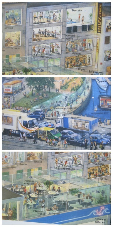 И не просто посмотреть на панораму того или иного города, а заглянуть в окошки, посмотреть внутреннее убранство дома или общественного здания. Прекрасная идея и исполнение художника - убрать стеночки, чтобы мы увидели… Как же я люблю разглядывать, чем же там занимаются маленькие человечки)