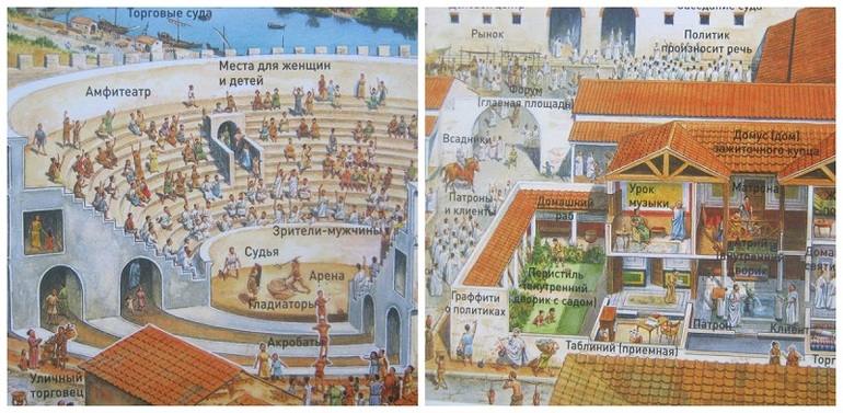 Начинается все с Истории Города, когда первобытные люди жили в пещерах, потом в шалашах, крытой соломой хижинах. Потом мы перемещаемся в цивилизацию и рассматриваем Греческую колонию (550 г. до н. э.), Римские граждане (120 г.), Средневековой город (1250 г.), Дворцы и фонтаны (1650 г.), Промышленный порт (1880 г.), Стекло и сталь (наши дни). После каждого «города» есть разворот с одним типичным зданием той эпохи, очень подробно в разрезе можно осмотреть все помещения и прочитать. Вот эти типичные здания: Храм, Общественные бани, Замок, Городская ратуша, Железнодорожный вокзал, Высотный дом. Мне персонально нравится высотный дом.