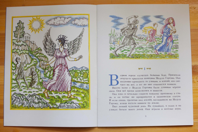 "Глядя в зеркальный щит, в котором отражалась Медуза, Персей подбежал к ней и сразу одним ударом меча отсек её ужасную голову. Голова отлетела прочь и покатилась к ручью.