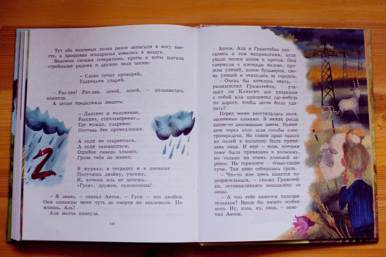 Аля, Кляксич и Вреднюга. Тут все тот же первый класс, но речь про гласные и согласные, про правила правописания букв с слогах. Нашему дошкольнику последняя часть далась с трудом. Именно в плане понимания что, зачем и отчего. Но просил дочитать до конца.