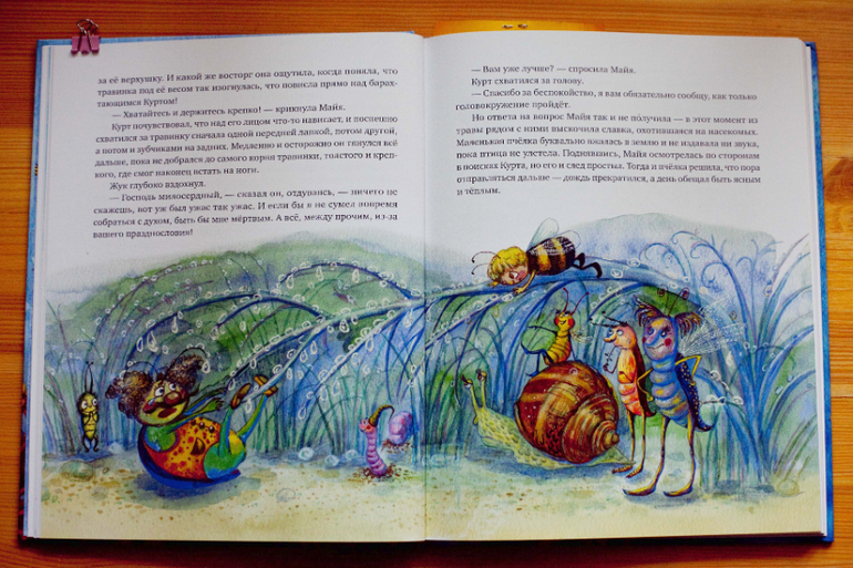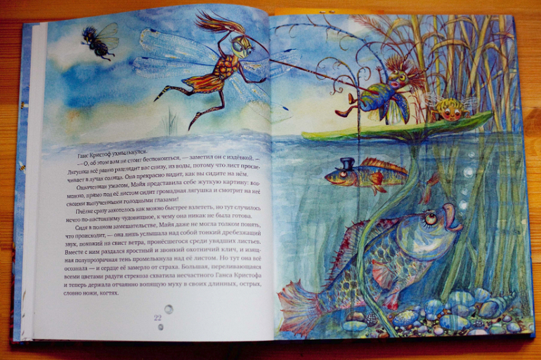 больших серьезных глаз разбойницы, но крылья стрекозы, сверкавшие, как драгоценные камни, ей очень понравились. Однако, заметив огромные размерыхищницы, Майя окончательно струсила и, не понимая, как вообще осмелилась вмешаться, задрожала от страха.