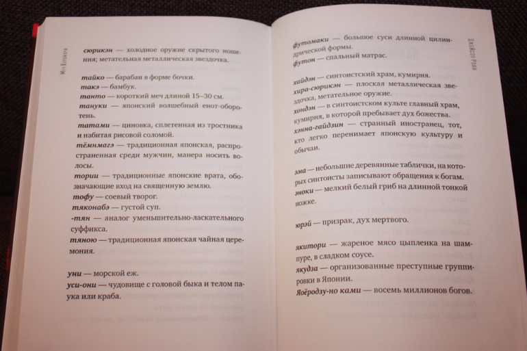 В конце книги есть небольшой словарик японских слов. Отдельно незнакомых понятий (хотя многие встретят там знакомые "суси", "манга", "бонсай" и "дайкон", прочно вошедшие в нашу жизнь) и отдельно слов, которые герои произносят на японском.