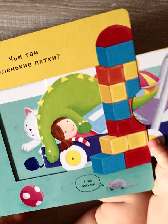 Когда я решила написать пост она не могла крутить бумажное колесико, сейчас у нее уже получается. В серии несколько книг, я выбрала самую домашнюю, к счастью там несколько раз изображен котенок, а на сегодняшний день это наша страсть. Кота мы обнимаем на каждой страничке.