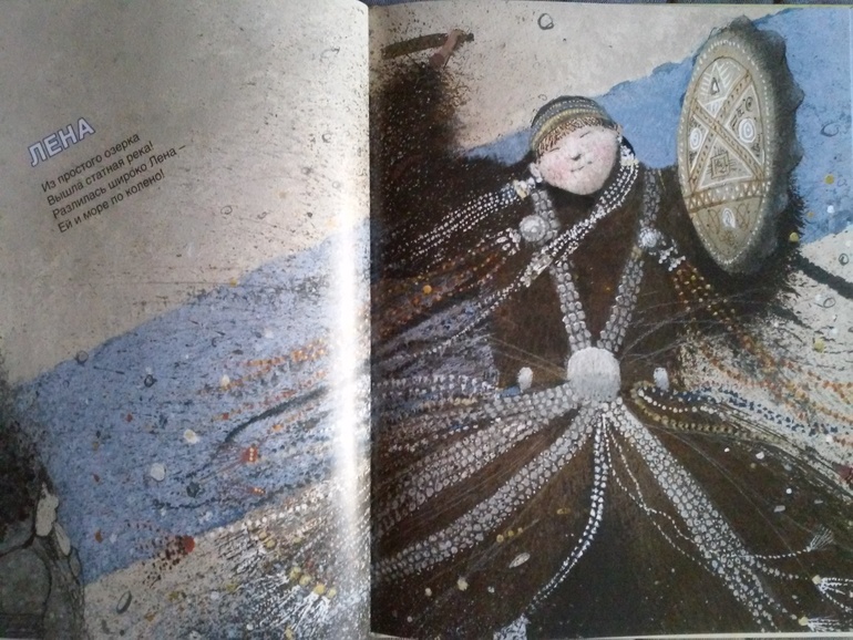 А это образ Лены от Игоря Олейникова. Такой летящий, под ритм бубна образ молодой девушки в расцвете своей красоты. Посмотрите сколько украшений, и это не спроста, ведь Лена богата крупными месторождениями золота и алмазов! В отличие от художественного образа, в якутском фольклоре Река Лена представляется бабушкой. Я за вечную молодость! Понравилась мне танцующая Лена, в ней чувствуется спокойствие и великолепие.