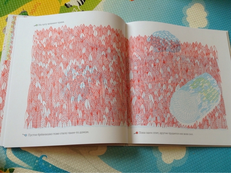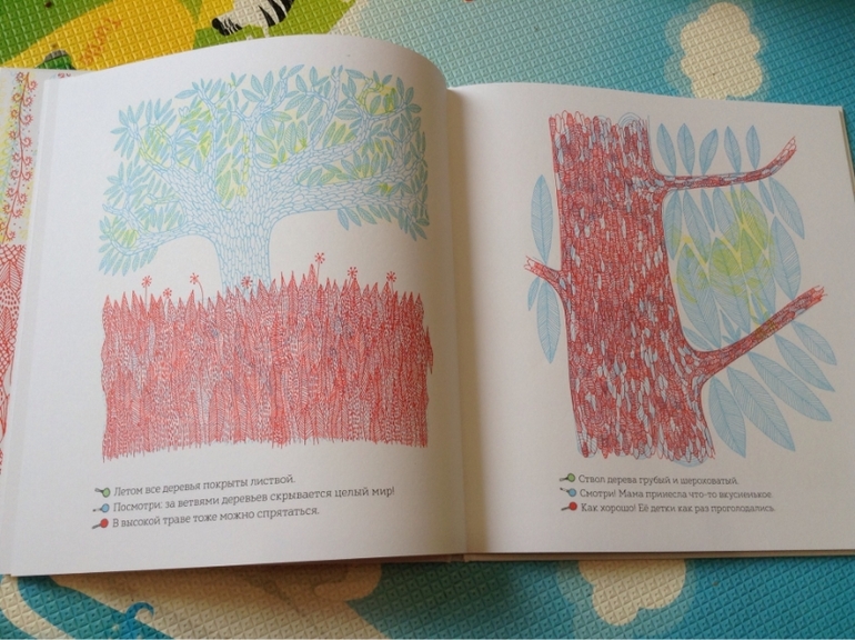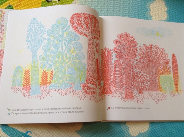 Это не обычная книга, а интерактивная. Но в ней Вы не найдете каких-либо кнопочек, окошек, панорамок. Внешне она выглядит более чем скромно: белые листы и на них линии красного, синего и желтого цвета, переплетающиеся в причудливые узоры. На первый взгляд в книге изображены только пейзажи - деревья, река, озеро - причем изображены они достаточно схематично.