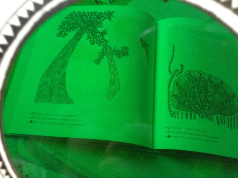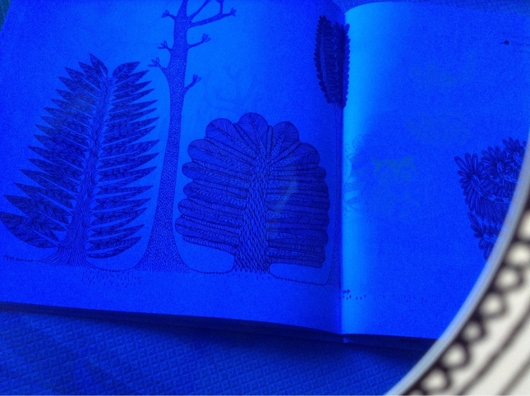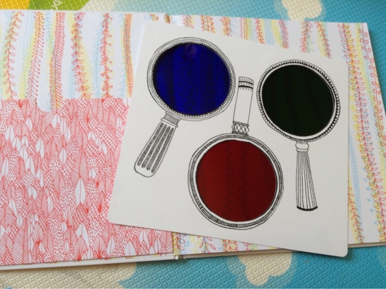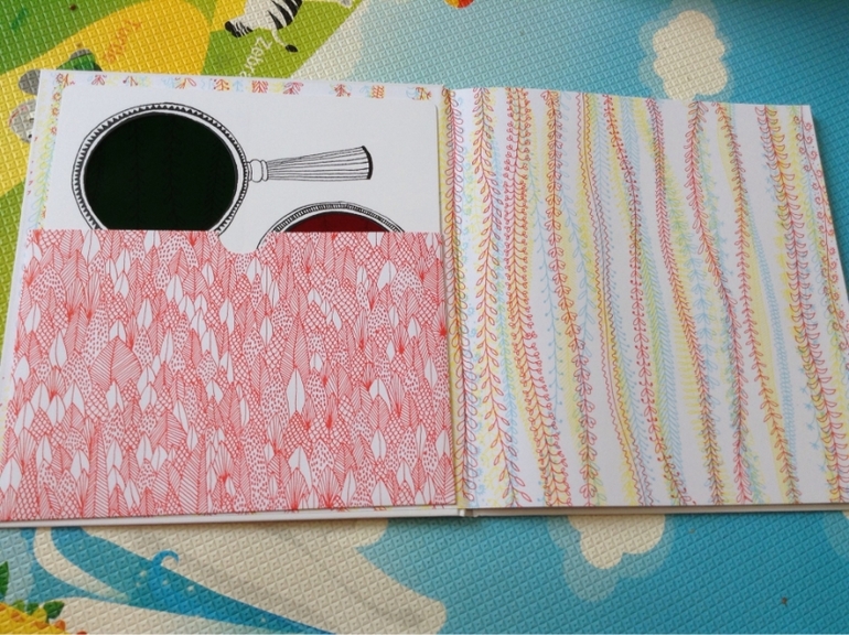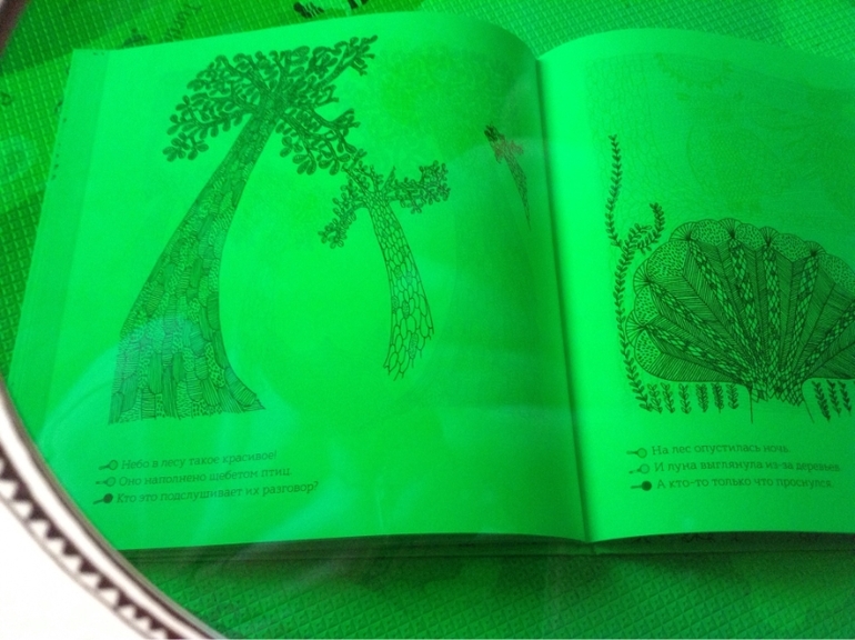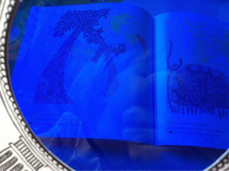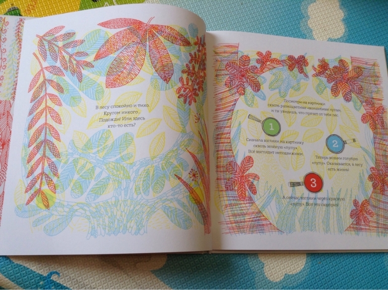 В чем же секрет этой книги? В кармашке, приклеенном на форзац, спрятан лист с тремя «волшебными лупами». На самом деле это не лупы, а цветовые фильтры: синий, красный и зеленый. Если по очереди прикладывать их к страницам книги (а лучше смотреть сквозь них), иллюстрации будут меняться и «оживать». Через фильтры можно увидеть то, что было спрятано за переплетением разноцветных линий.