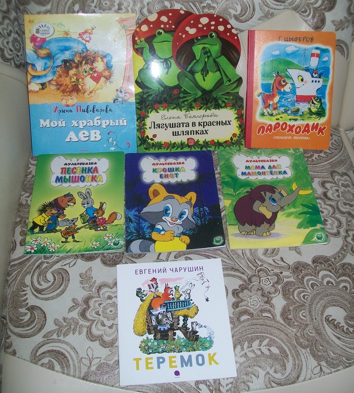 8. Три книжечки из серии Мультсказка. Иллюстрации из мультиков, очень красочные. Читать их пока отказывается, только перекладывает их с места на место.
