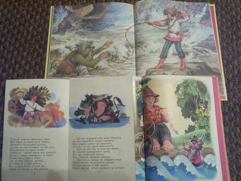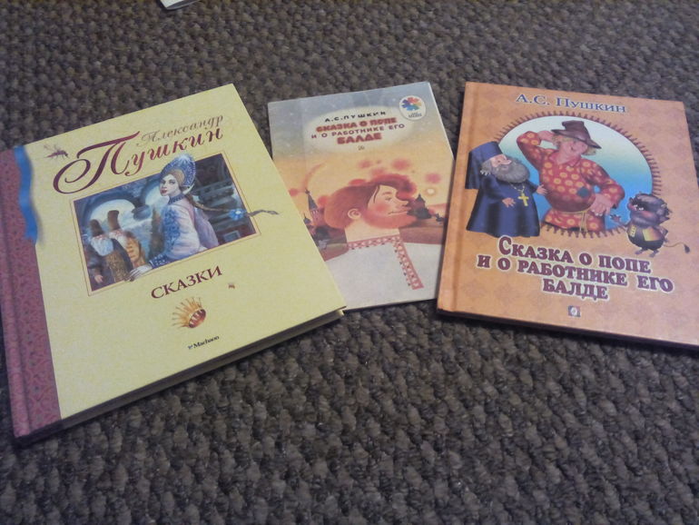 Дальше читали сказку о Балде в трёх вариантах иллюстраций. Мне нравится Бритвин, ребенку от издательства Фламинго с Бедаревым.