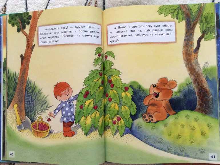 8. " Петя и Потап" Виктор Чижиков. Книга содержит 3 сказки: известная про медведя и мужика, которые делили вершки и корешки. И две сказки, про внука мужика и внука медведя. Качество книги отличное, на мелованной бумаге, картинки яркие, красивые, на каждом развороте немного текста. Вообщем, я была уверенна в успехе книги, а нет, прошла мимо, даже один раз не прочитали и не рассмотрели до конца.