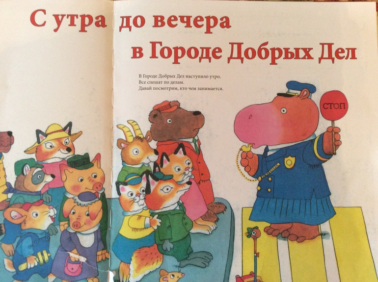 1. "С утра до вечера в Городе Добрых Дел" Ричард Скарри. Рассказывать о чем книга, думаю, смысла нет, все и так знают. Спасибо тем, кто посоветовал взять именно её, а не "Город Добрых дел". Книга у нас пошла хорошо, правда не с первого прочтения, даже убирала на пару дней, думала на вырост оставить. Но нет, очень заинтересованно рассматриваем картинки, выслушивает рассказ о жителях города. И как, не странно, любимый разворот с пожарниками! Зато знаем теперь, что такое гидрант, дедушка был в шоке) само качество листов и рисунков меня разочаровало, бумага грубая, рисунки не четкие, на первом листе, ощущение, что краска отпечаталась. Хотела даже вернуть, не захотела просто заморачиваться.