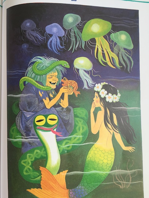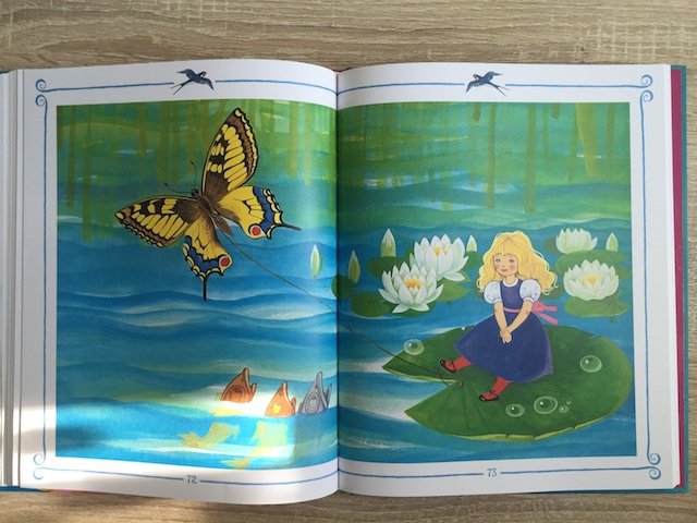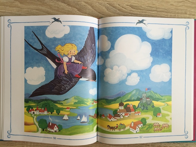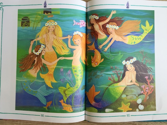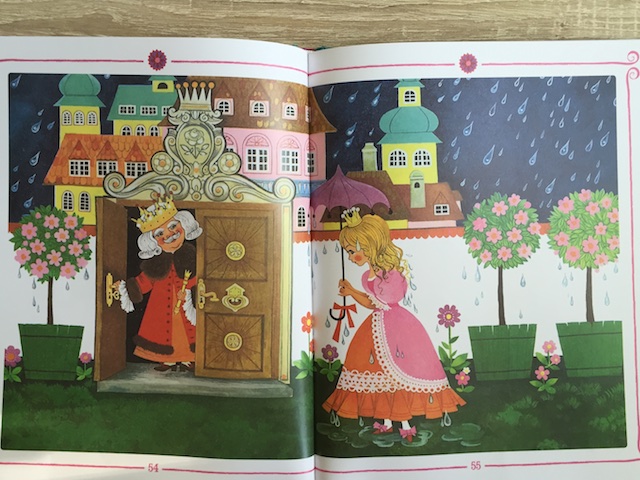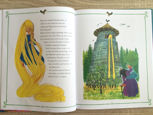 Книжка была в пленке, не разглядишь, что внутри. Но мы уже держали ее в руках и я достала кошелек. Все же в последний момент перед покупкой я попросила пленку снять, чтобы посмотреть состав сказок и другие иллюстрации. И, хотя дублей я избегаю, а все эти сказки есть у нас или на русском, или на немецком, а некоторые и на обоих языках, отказаться от книжки я не смогла. Эти иллюстрации - яркие, но не кричащие, нежные и очень-очень детские, даже к таким совсем немалышковым сказкам, как "Русалочка" или "Рапунцель", - покорили меня с первого взгляда. Конечно, они явно страдают излишней мимишностью, но маленькая девочка внутри меня прижимала руки к груди от умиления, а стоящая передо мной живая девочка Настя так же нежно прижимала к себе эту книжку.