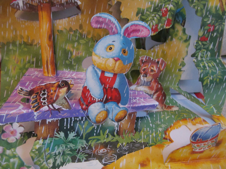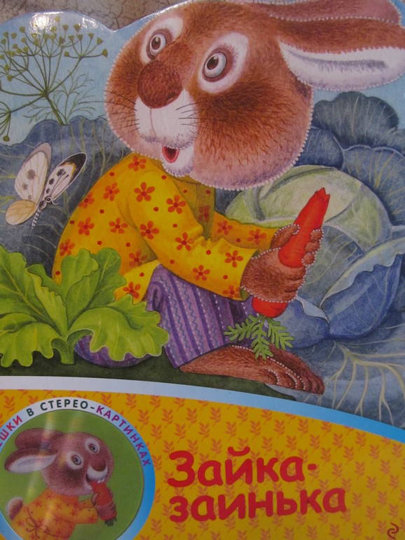 Интересная деталь книжки - стерео-картинка с "мультфильмом", где зайка грызет морковку.