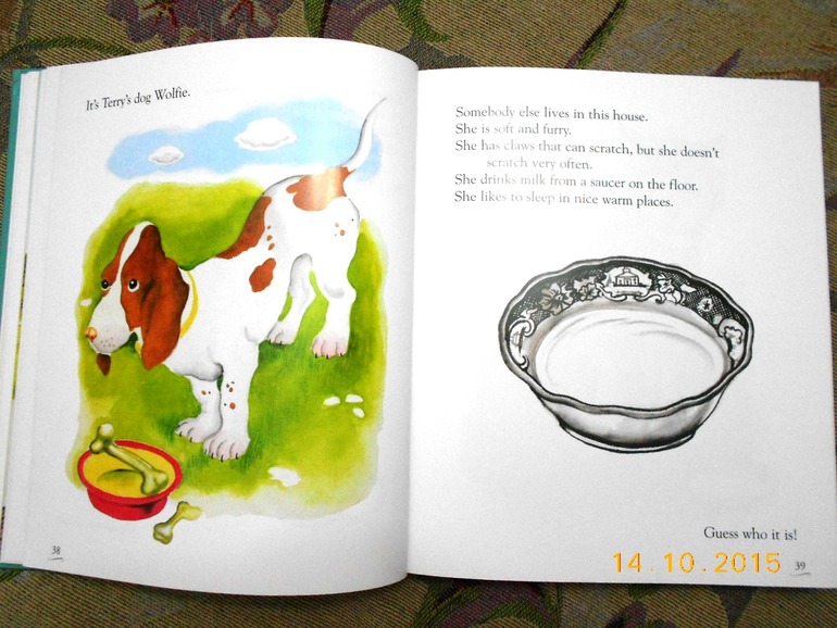 Другая история подлиннее. Про большой дом и всех, в нём обитает, про ветер, дождь, солнце и луну, под которыми он находится. Каждая страница заканчивается словами: «Угадай, что это!», и можно ждать ответа от ребёнка - так интереснее.