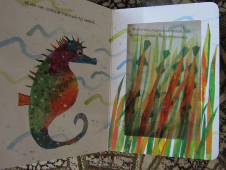 Ещё у сыночка в доступе есть "Морской конёк" Эрика Карла, да до текста мы ещё не доросли, но это единственная книга Карла у нас дома. Так, что для разнообразия пусть листает, тем более ему по-видимому нравятся прозрачные вставочки в книге.