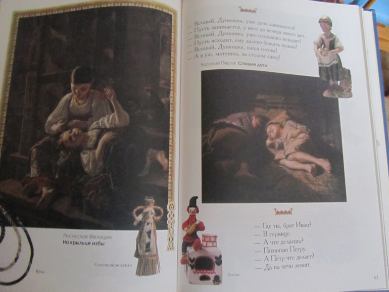 Книга содержит разные потешки, прибаутки, колыбельные, хотя рисунки не детские, в основном репродукции картин