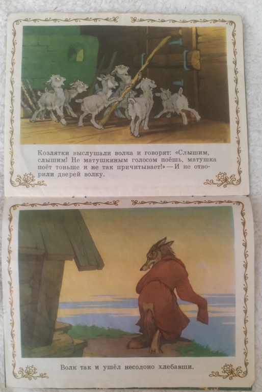 4. Козлятки и волк. Русская народная сказка в обработке К.Ушинского с иллюстрациями П.Репкина. Год издания примерно 1989, а вот издательство не смогла определить (написано про оригиналы, про какой-то комбинат игрушек и все).