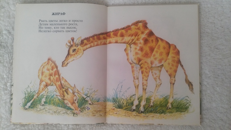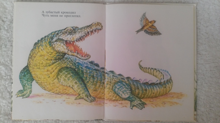 Прекрасный для нашего возраста текст, хорошие рисунки (хотя лично мне некоторые не очень нравятся). Разнообразили познание в животных до буйвола, моржа. И, конечно, с удовольствием изображаем, как зубастый крокодил чуть воробья не проглотил)))