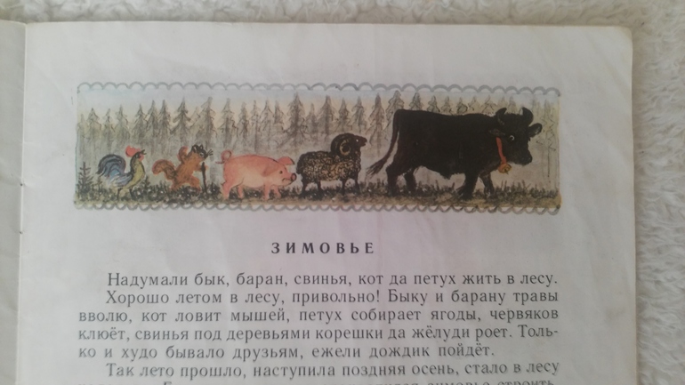 Обложка не сохранилась, а вот содержание в полном порядке: храбрый баран, зимовье, полкан и медведь, заячьи слезы. Дочке пока не очень понравилось. Картинки смотрит и немного слушает, но сама никогда не просит эту книгу. Думаю, еще дорастет.