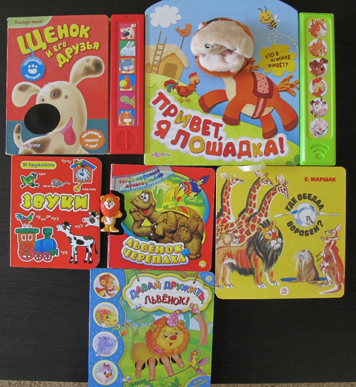 Щенок и его друзья очаровательная книга, животные разговаривают, купили когда мелкий был сосем мелкий - сейчас сам нажимает на кнопки и трепет хомяка за усы)) Книга с лошадкой тоже очень милая - жует ей морду.