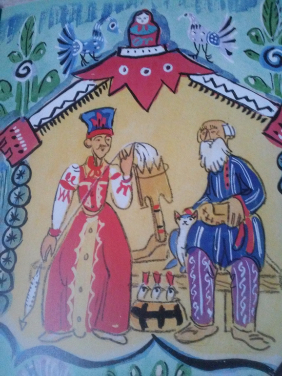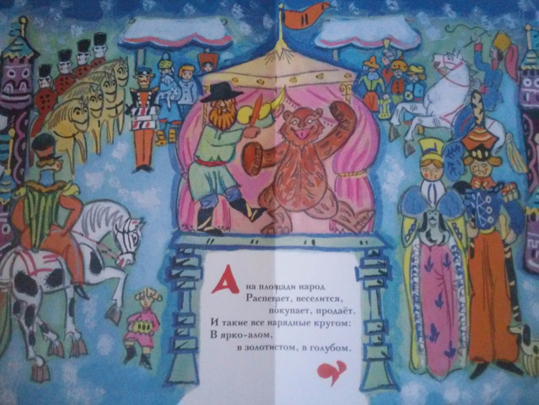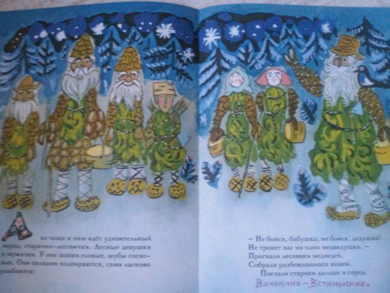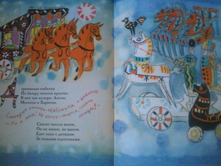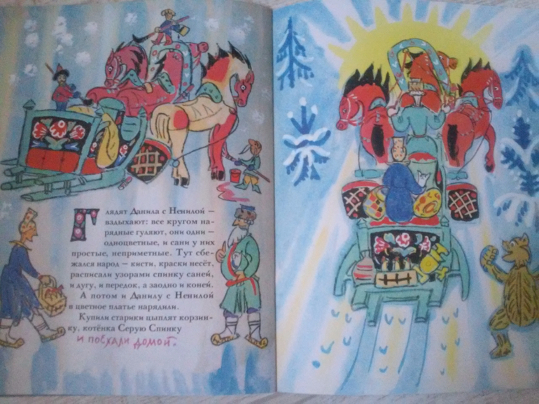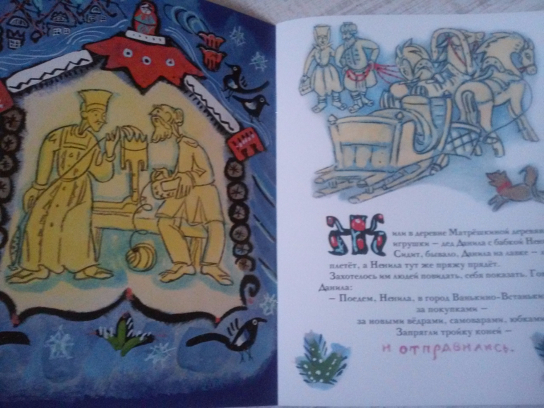 Очень нам понравилась новинка от речи "Тройка" с иллюстрациями Мавриной, я рада, что у нас появилась эта яркая книжечка с интересной историей про деревянных старичков Ненилу и Данилу, которые отправились на ярмарку из деревни Матрёшкиной за покупками в город Ванькино-Встанькино, попали в приключение и кого они только не повидали, повеселились и вернулись с корзинкой цыплят и котёнком Серая спинка. А были то они одноцветные и сани у них простые, неприметные. Добрый игрушечный народ расписал узорами сани и заодно коней, нарядили стариков в яркие одежды!