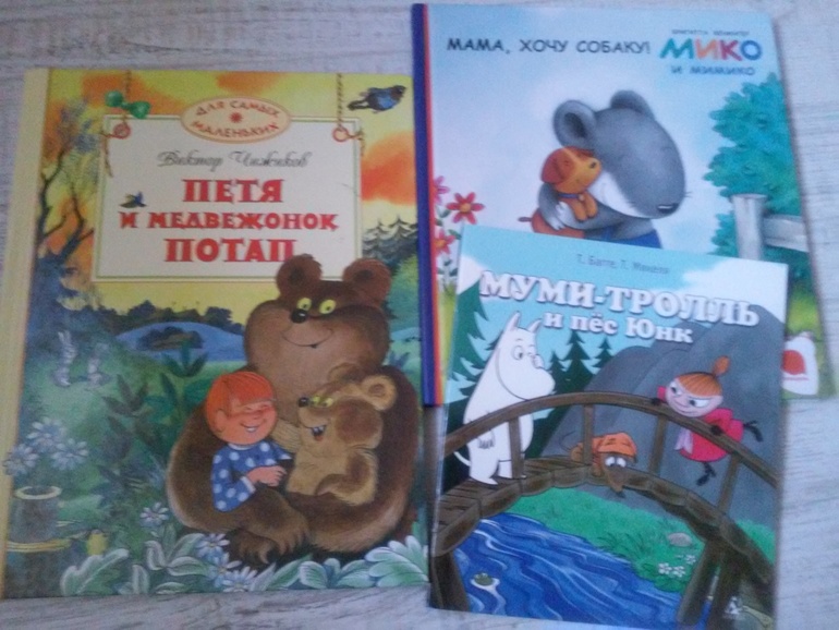 Вновь с удовольствием перечитывали эти книги: "Мама хочу собаку!", "Петя и медвежонок Потоп", "Муми-тролль и пёс Юнк".