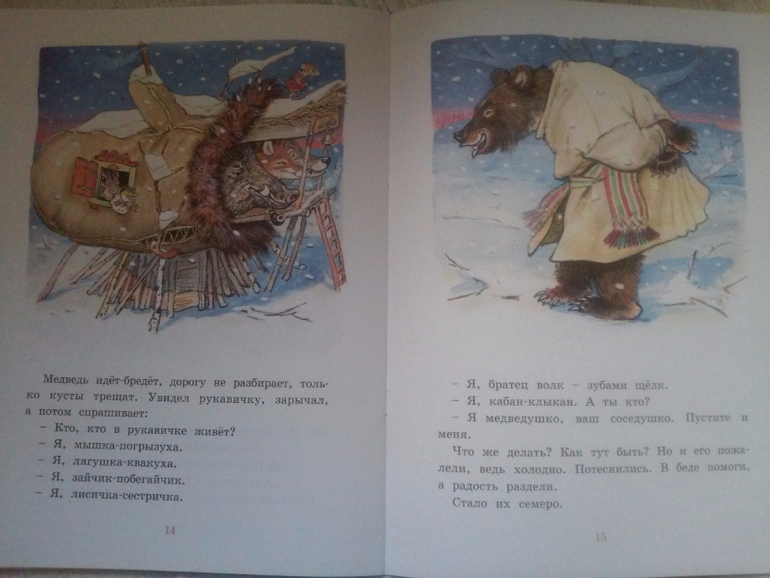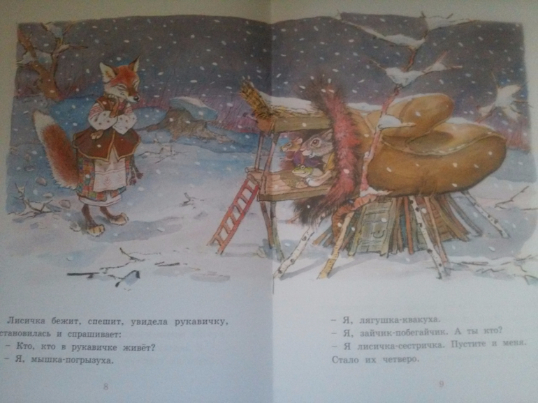 Тоненькая "Рукавичка" с рисунками Рачёва. Классическая сказка в хорошем качестве и оформлении. Чувствуется приближение зимы, Рада ждёт её с сентября, поэтому с удовольствием вспомнила сказку, поговорила за зверей и помечтала о снеге и руковичках.