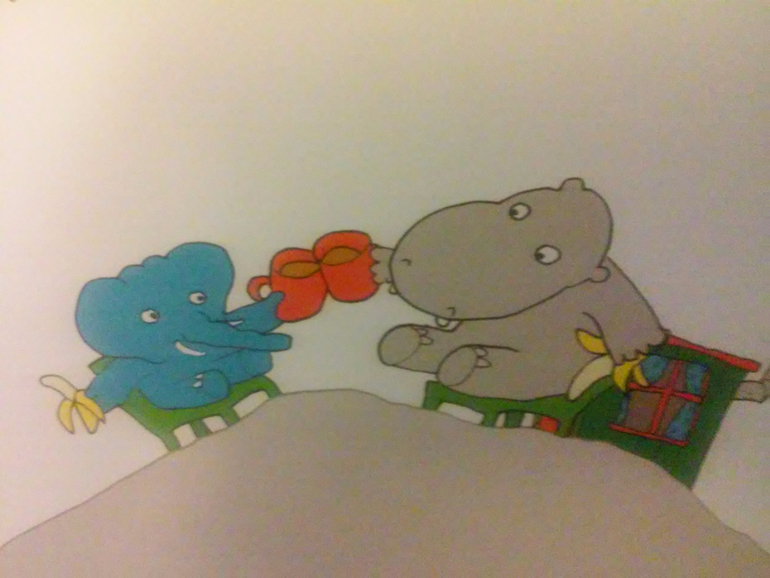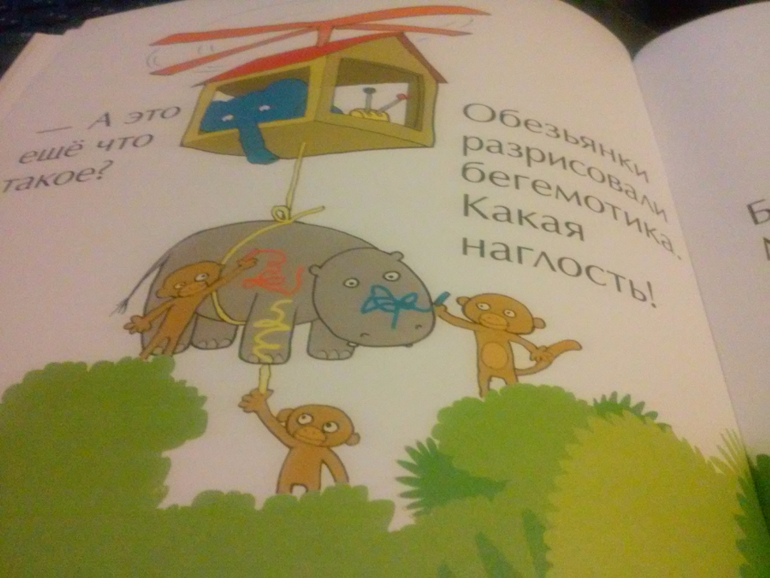 После поста Насти про Мимбо-Джимбо сообщество разорвало на множество синих слоников и мы не стали исключением. Мимбо-Джимбо прошёл двойное испытание на интерес и как книга для первого чтения, и надо признаться вам на отлично. Нет не сама, Рада ещё не читает, а читала ей шестилетняя подружка Кира. Закрылись в комнате и дружно смеялись, потом пели Мимбо-Джимбо, Мумбо-Джумбо на свой лад. Неожиданно долгоиграющей оказалась книга, то Кира её сама перечитывала, сама целую книгу! То Рада просила меня почитать. В чём секрет, сюжет то для детей двух лет? Хотя как на это посмотреть, в ней есть милые герои, захватывающее путешествие, мокание друга в море после хулиганского граффити, спасательная операция и не одна, а самое главное дружба! Хорошо когда после опасных приключений можно с другом выпить по чашечке какао с бананом, рядом с уютным домиком на горе, и зубы почистить перед сном, вместе.