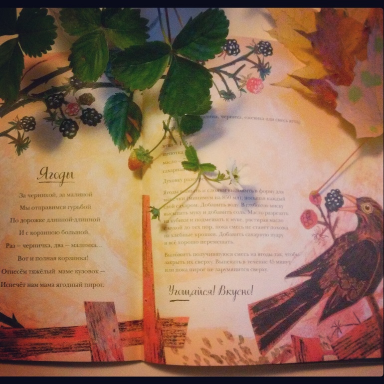 Потом немного листали "Большую книгу природы" такого дикого восторга как у меня, у ребёнка она не вызвала, но яблочки с удовольствием "покушала", жаль что в ней нет моих любимых сортов Апорта и Лимонки, а так конечно все иллюстрации выглядят реалистично, очень красивые. Рада даже собиралась дубовые листочки подцепить пальчиком. Прекрасная книга для созерцания, открываешь, а там белка игриво смотрит как настоящая, в чёрной ночи нежные мотыльки кружатся, а ягодки из лета готовы прыгнуть в ваш пирог, не знаете как его испечь, есть рецепт! Можно даже приготовить угощение для птиц или прогуляться по пляжу и собрать красивые ракушки или полюбоваться сияющим звёздным небом. В этой удивительной книге собраны интересные наблюдения о природе по временам года, стихи, заметки о животных и растениях, загадки. Выйдите на улицу и обнимите ОСЕНЬ!