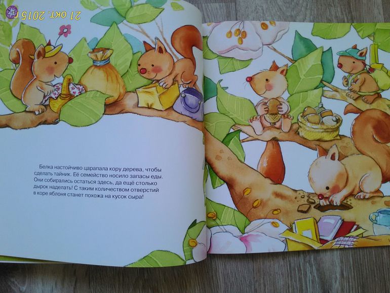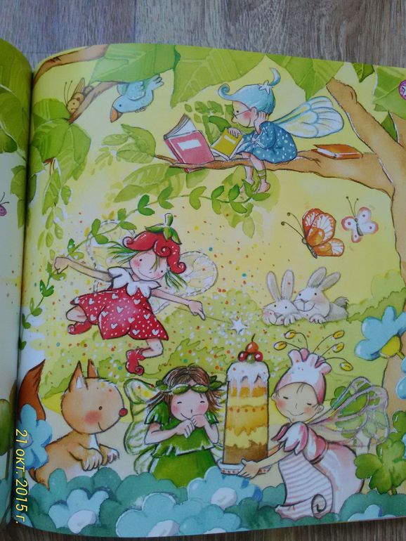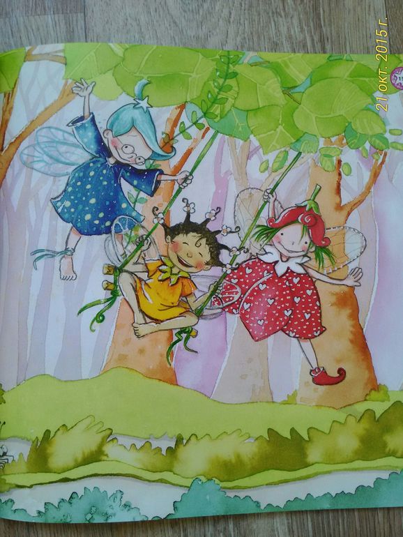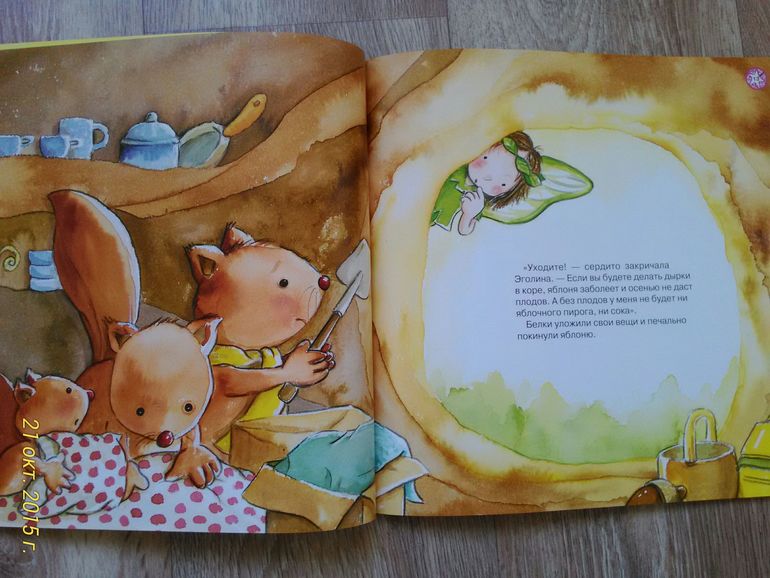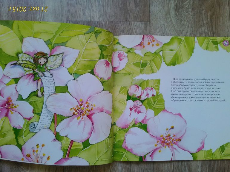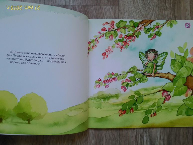 Книга про маленькую фею, которая не хотела делить свою яблоню с другими, и в итоге осталась одна. Мы и взяли эту книгу, потому что Юля уже понимает, как плохо себя так вести.