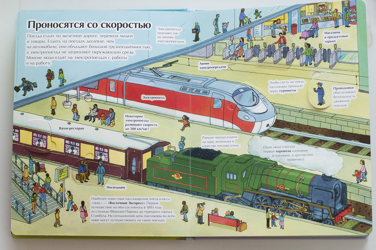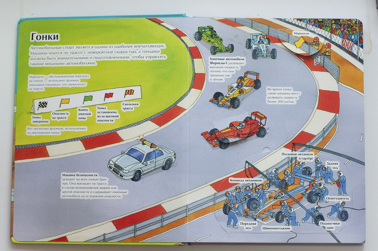Во-первых, книга в простых и понятных картинках объясняет малышу, что и как ездит, летает, плавает. В книге восемь разворотов (гоночная трасса, аэропорт, железнодорожный вокзал, круизный лайнер, метро, корабли над водой и под водой, стройка и космос). Текст простой и недостаточно информативный, но для возраста 2-4 лет достаточно, тем более, что книгу «читать» скучно, ее надо рассматривать, рассказывать, сочинять истории, как в классическом виммельсбухе.