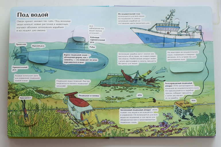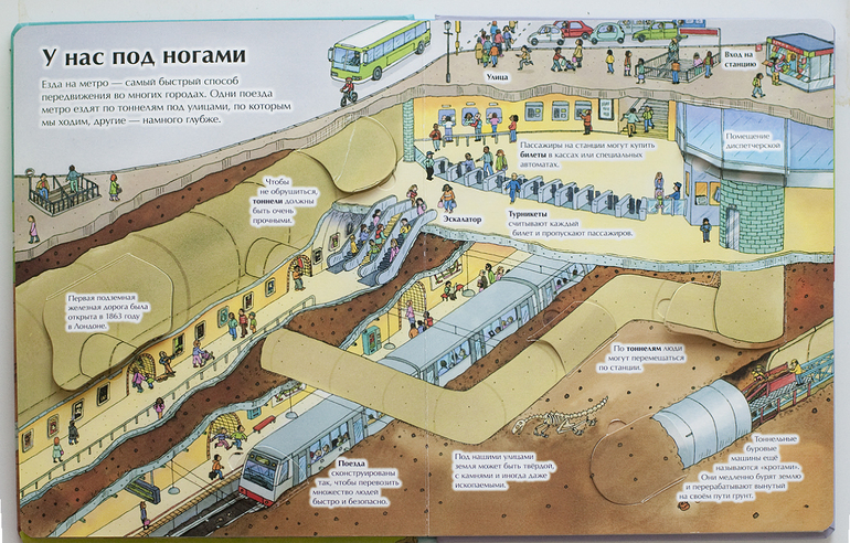 Не устаю любить и восхищаться этой книгой, хотя иногда мысленно вою, когда сын (в который раз!) тащит ее читать. Ведь это так интересно, сидя дома на диване, заглянуть на морское дно и узнать, что нашел в куче водорослей подводный аппарат, или прогуляться по круизному лайнеру и даже посмотреть, как копают метро! Книга научит вас передвигаться в пространстве и времени, так как часы за ее «чтением» летят незаметно.