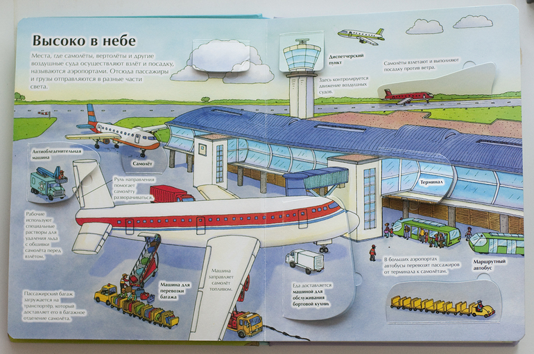 Для нас любимый разворот это аэропорт. Конечно, ведь мы живем в непосредственной от него близости. Самолеты - наша жизнь, и тут мы знаем все. На картинке можно рассмотреть, как пассажиры ожидают вылета в аэровокзале, как буксируют на стоянку, как заправляют лайнер, загружают питание, заглянуть в диспетчерскую вышку и, конечно, лично увидеть взлет!