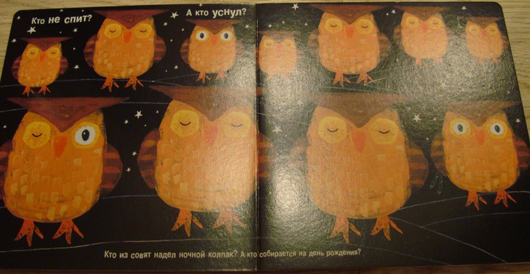 Здесь мы ищем противоположности. Толстых и худых, радостных и грустных, грязных и чистых, спящих и бодрствующих. Снова отвечаем на вопросы и теперь ищем того, кто собрался на день рождения.