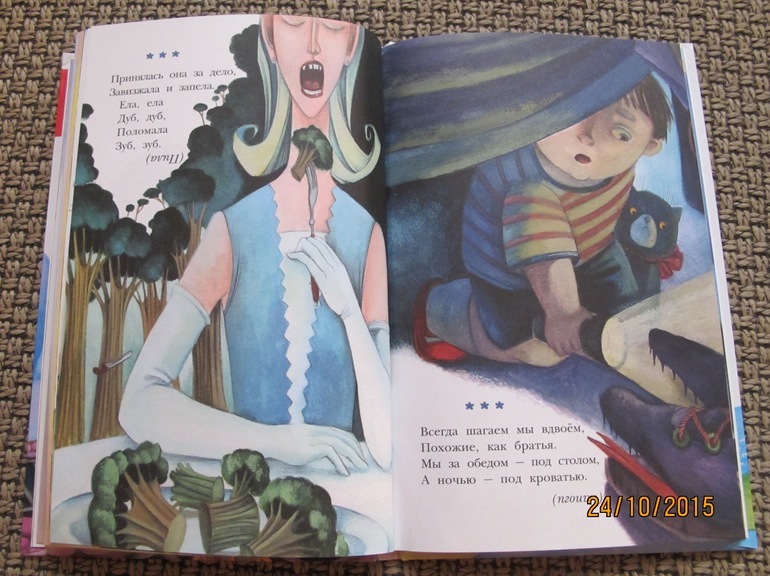 В книге есть истории-картинки про девочку Машу и куклу Наташу, которые в особенности полюбились средней, Мышка и кошка под одной обложкой, и история про Мышиного короля. Средняя недели две таскала книгу везде за собой, всем рассказывала-пересказывала истории про девочку и куклу.