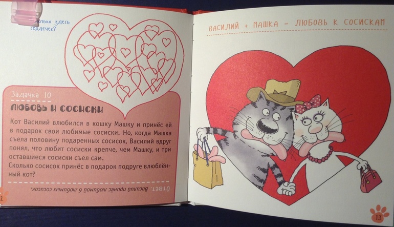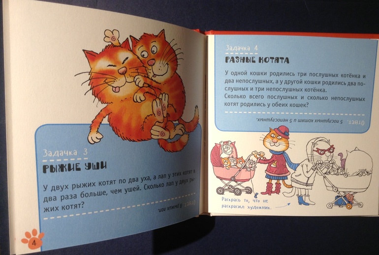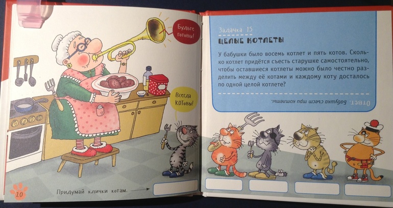 Здесь задачки все посвящены кошкам. Возрастное ограничение стоит 3+, но решить в три года такие задачки мало кому под силу. Всего в книжке 15 задач с ответами.