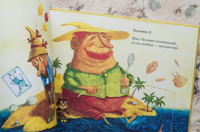 Однажды, в целом, намного лаконичней в оформлении. Стихотворение про остров, к примеру. Одна лишь только скромная пальма. Но стоит отметить, что художница использует не только сами иллюстрации в качестве средства выражения. Она задействует всю страницу, играет цветом фона и шрифта.