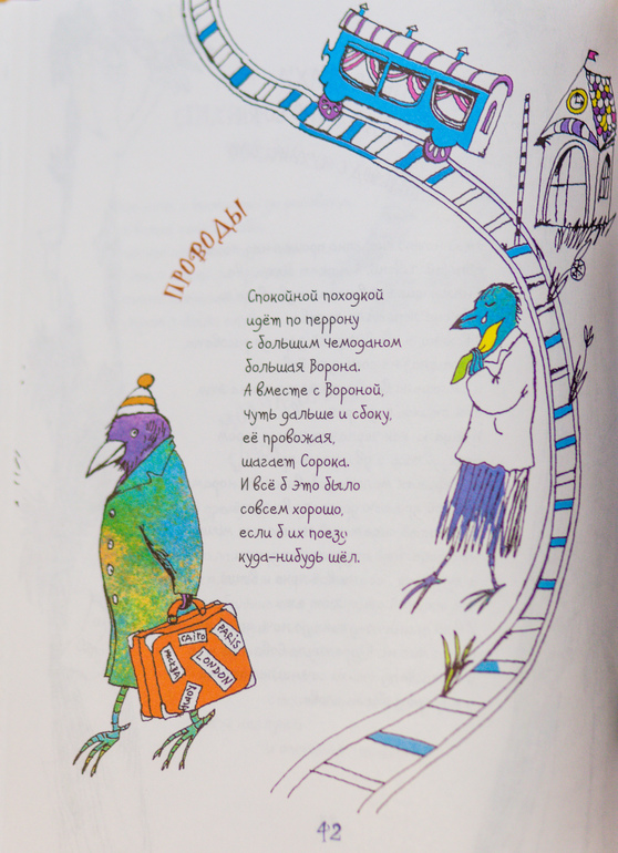 У Антоненкова колоритная мадама получилась. И серьги тебе, и броши, и утончённо зажатый в крыле билетик, и чумодан с Парижу. А воронёнок под мышкой с мишкой - слеза умиления на моей щеке. Только поездом что-то совсем не пахнет. В Однажды вон хоть рельсы с часами нарисовали. Хотя, возможно, это такое восприятие стиха у художника. Философское. А ведь и нет никакого поезда, и перрона нет, а, может быть, и нас с вами тоже нет, и все мы только кому-нибудь снимся. Вороне, к примеру. Или вон тем подозрительным лыжникам.