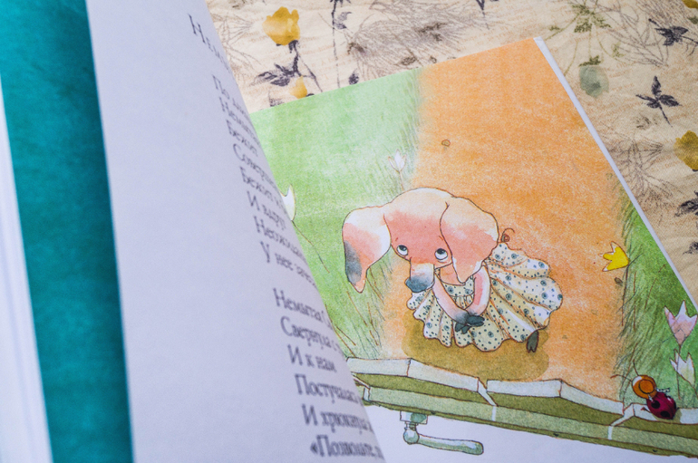 Ого себе, думаю я. А мы ведь разок только её просмотрели, и то мельком. И вот мы зависаем на этом развороте и я думаю, да что тут такого? Иллюстрации ведь не младенческие совсем. Я этот сборник совсем попозже читать собиралась. Но Алиска уже вцепилась в детали. Какой у него красный нос. Болеет, бедный. Надо ему лейкопластырь на хобот прилепить. У Алиски с пластырями сейчас особая мания, у неё все вокруг больные и ходят, как мумии, в скотче, наклейках и пластырях. И микстуры пьют, и таблетки горстями глотают аки депрессивные знаменитости. И тут я вспоминаю про Ужа. И мы начинаем читать и сравнивать.
