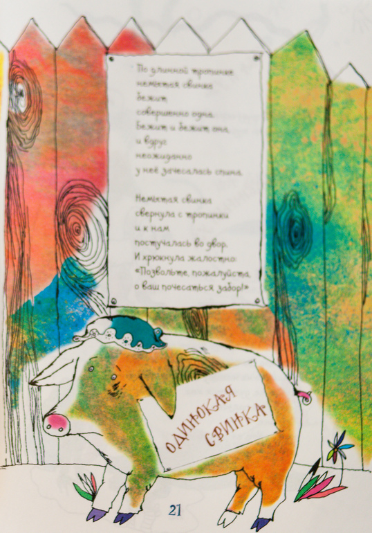Здесь свинка - воздушная, необычайно трогательная и вправду жалостная. Удалось, удалось художнице изобразить в свинячьем взгляде это просительное "позвольте".