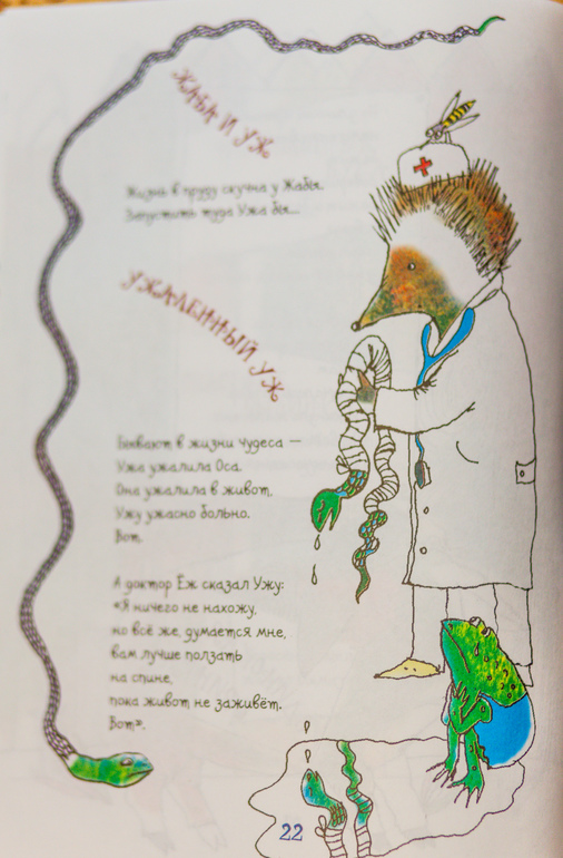 Ужаленный уж, он более детский, как вы уже и сами увидели. Антоненков по своему обыкновению чудит и шкодит. Он снижает возрастной порог, ведь сами стихи Ренаты Мухи - это юмор и игра слов, которые можно прочувствовать только старшим дошкольникам, а то и выше. Рисунки у Антоненкова крупные, яркие и очень выразительные. Пусть мало стихов, зато читать можно чуть ли не с рождения. И цвет! Мнооого цвета.