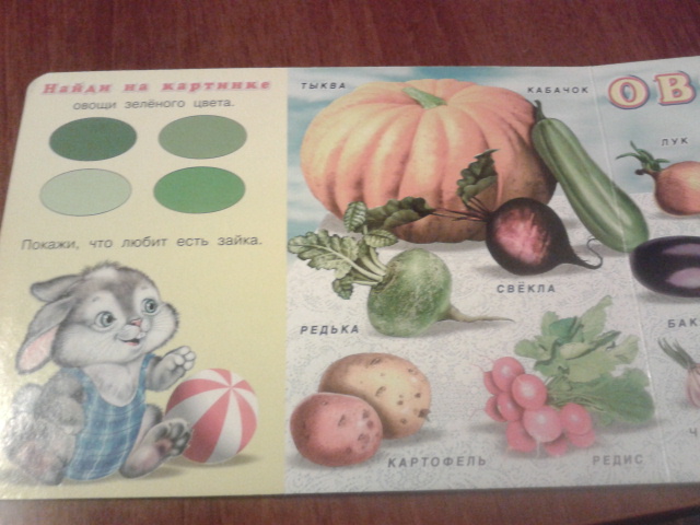 У нас овощи есть. Моим десятимесячным очень нравится, показывают зайку, огурчик, кабачок, кукурузу, арбуз, обезьянку... Конечно, на 100% мы ее пока не используем, т.к. маленькие, но она их, на удивление, очень привлекает! Реалистично прорисовано все.