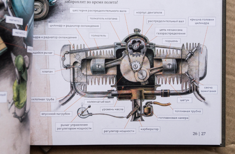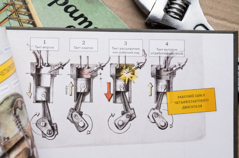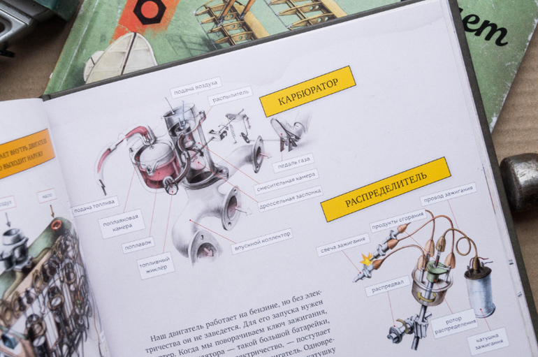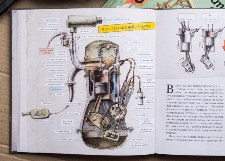 Но, надо отметить, разворот с устройством четырёхтактного двигателя меня впечатлил. Помню, как Коля не раз пытался объяснить мне это дело на пальцах. А пальцами тут, конечно, не обойтись. У меня на фото толком ничего не разобрать, но пугает слегка обилие надписей, да же? :)