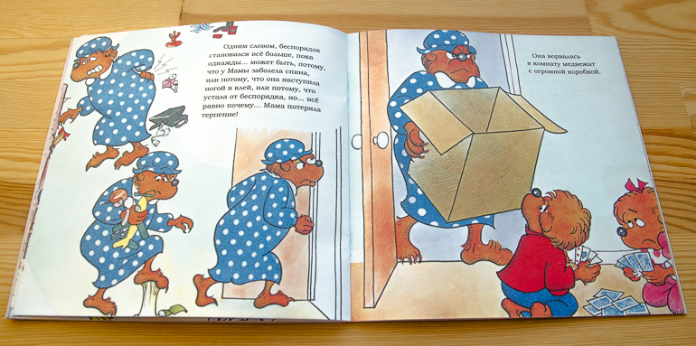 Но однажды маминому терпению приходит конец! Она врывается в комнату медвежат с огромной коробкой и начинает бросать туда все, что валяется на полу. Медвежата отчаянно протестуют, и, услышав их крики, в комнату приходит папа.